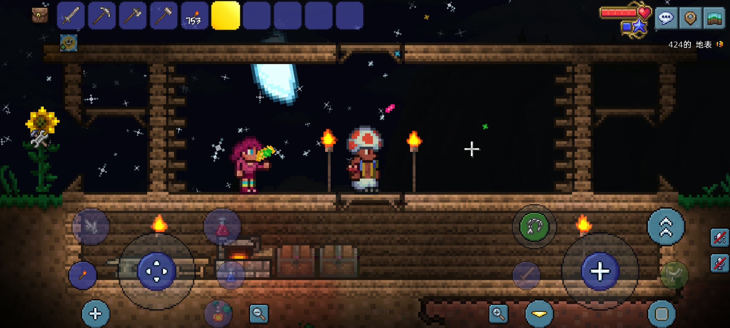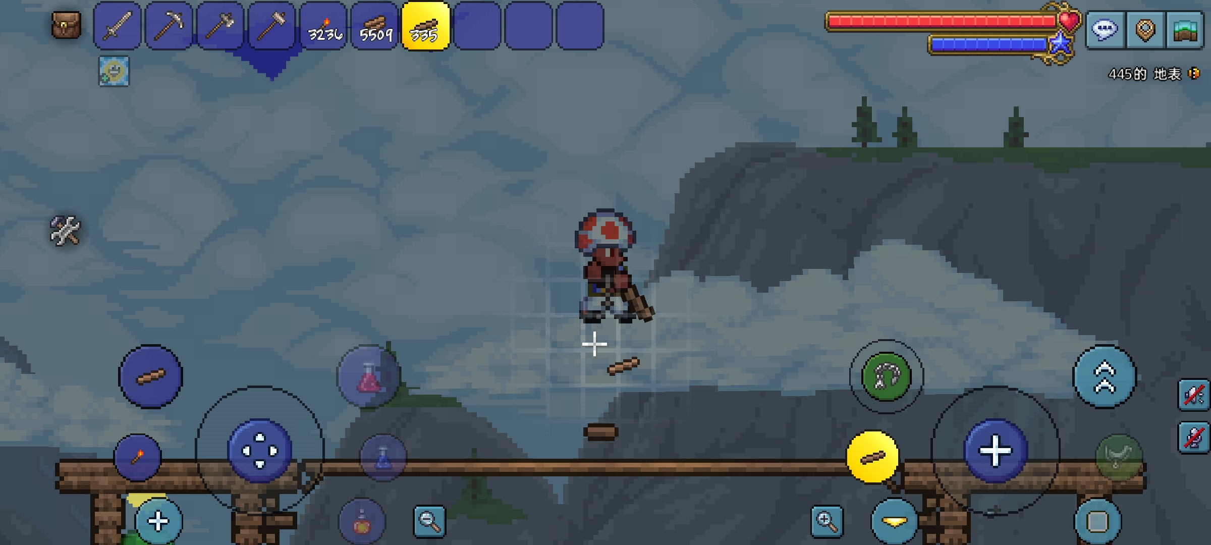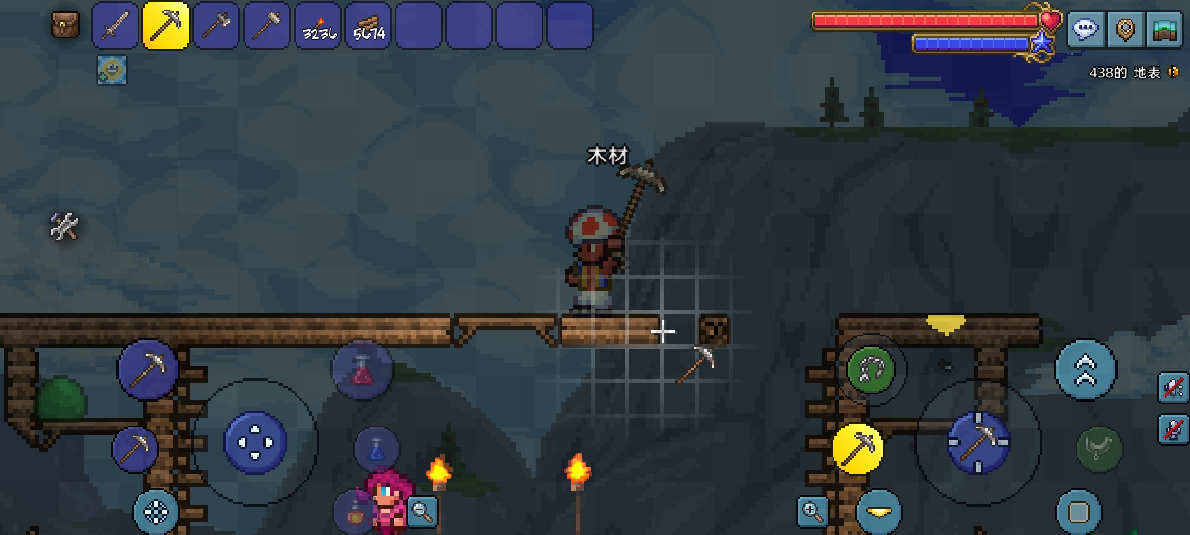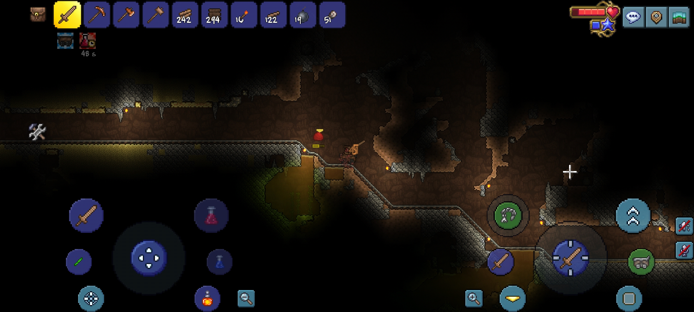 在下挖的途中,我发现了蘑菇小屋还有左上角的一个隐隐约约的生命水晶,等我们探索完蘑菇小屋就去挖那颗生命水晶吧!