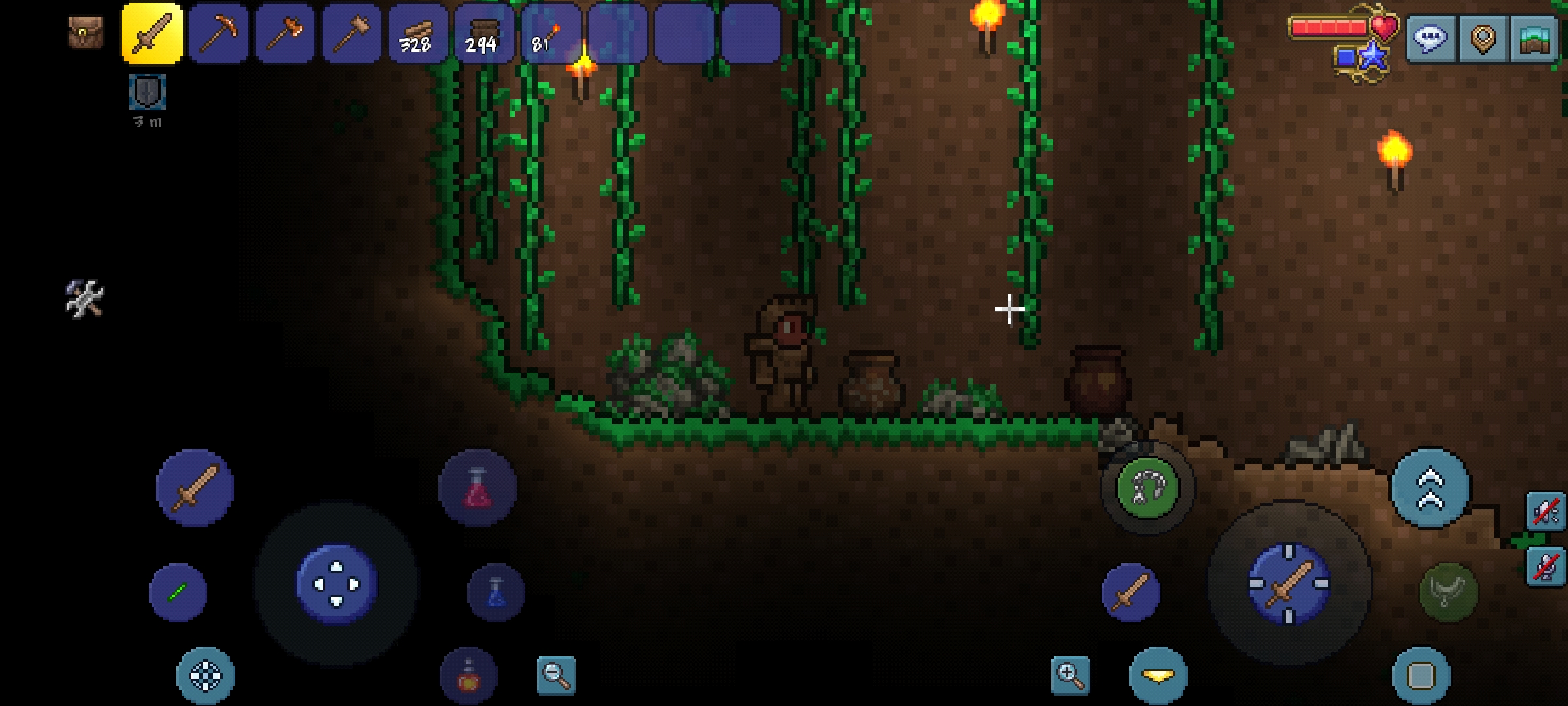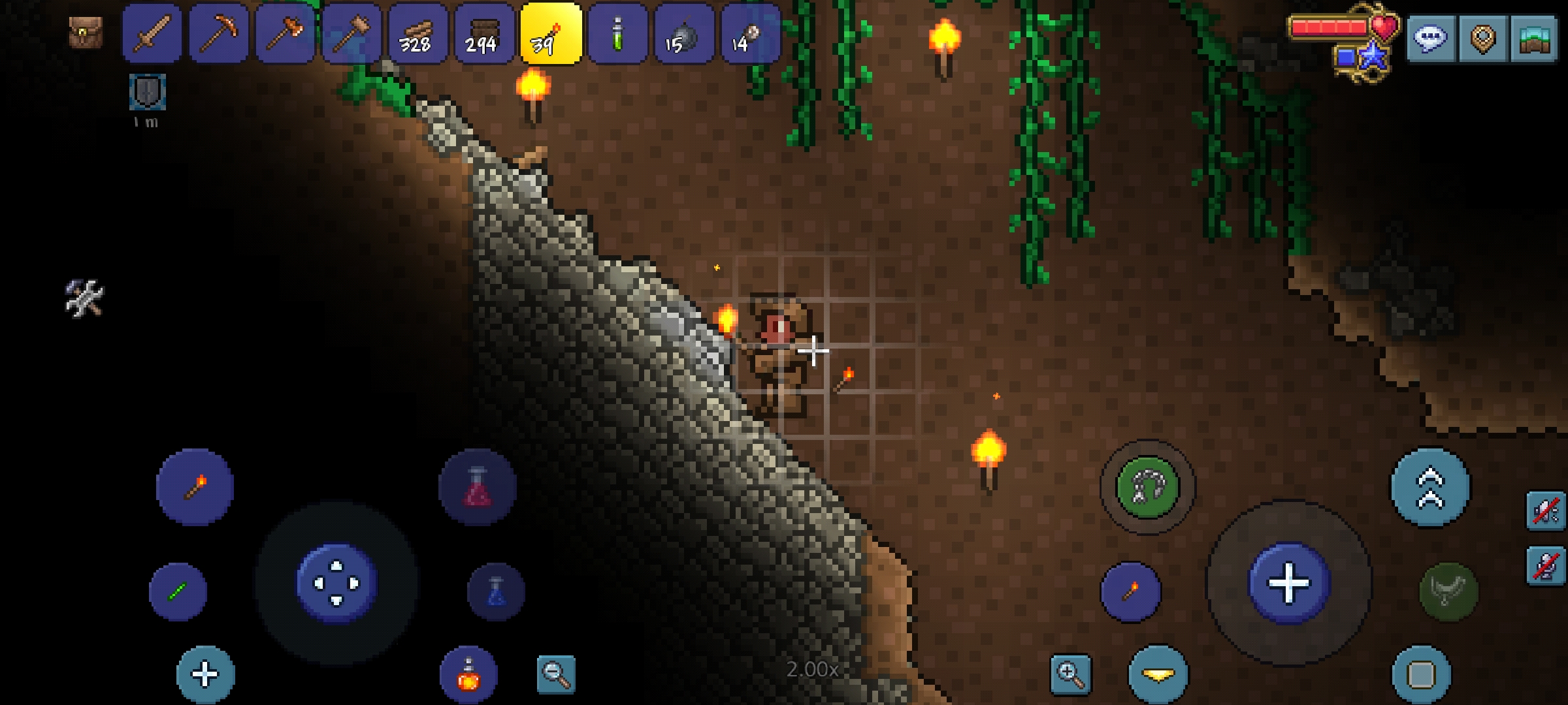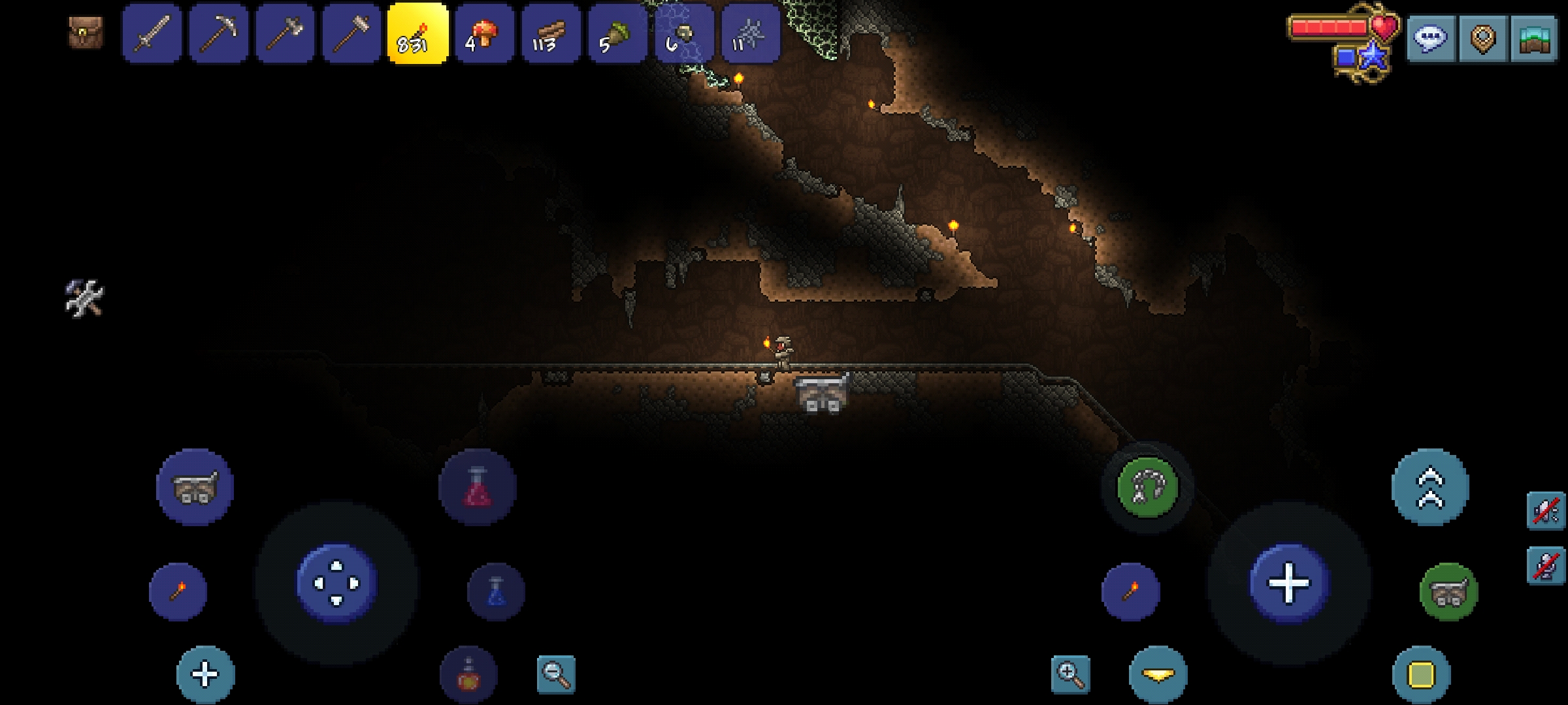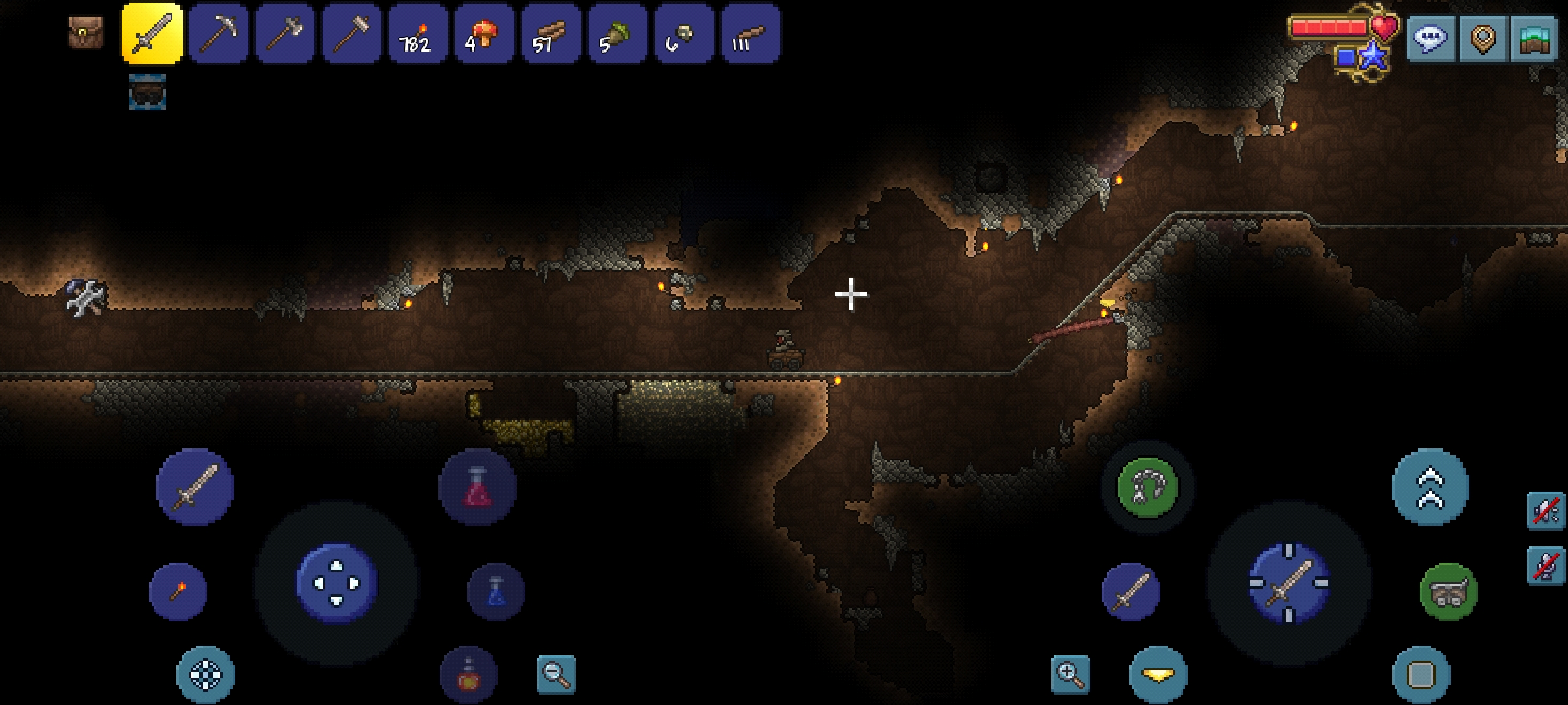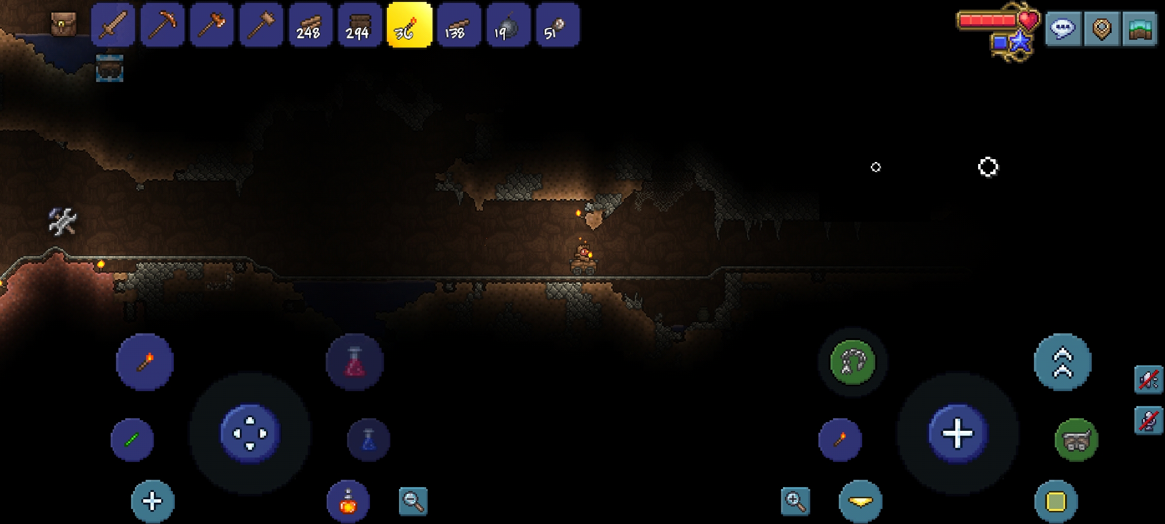 在下挖的途中,我发现了蘑菇小屋还有左上角的一个隐隐约约的生命水晶,等我们探索完蘑菇小屋就去挖那颗生命水晶吧!