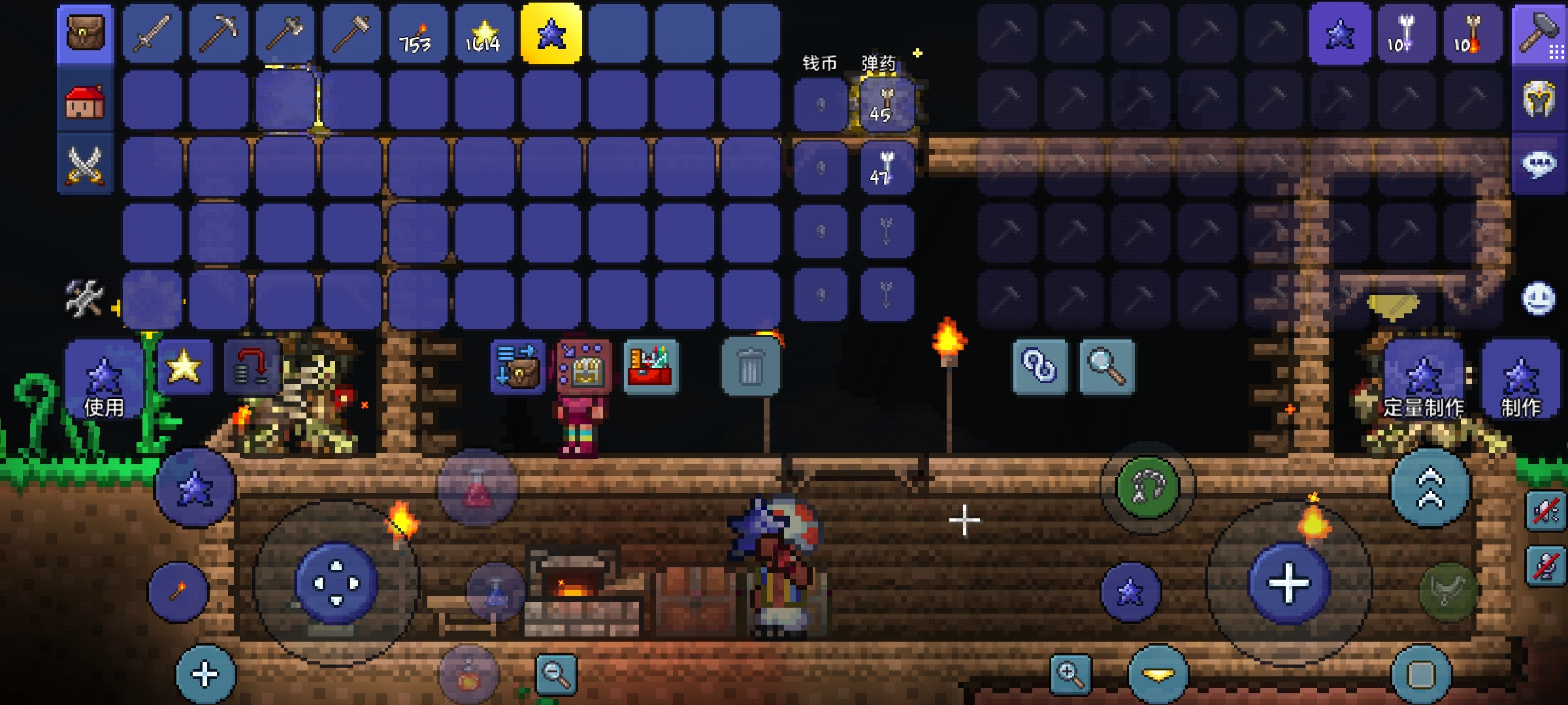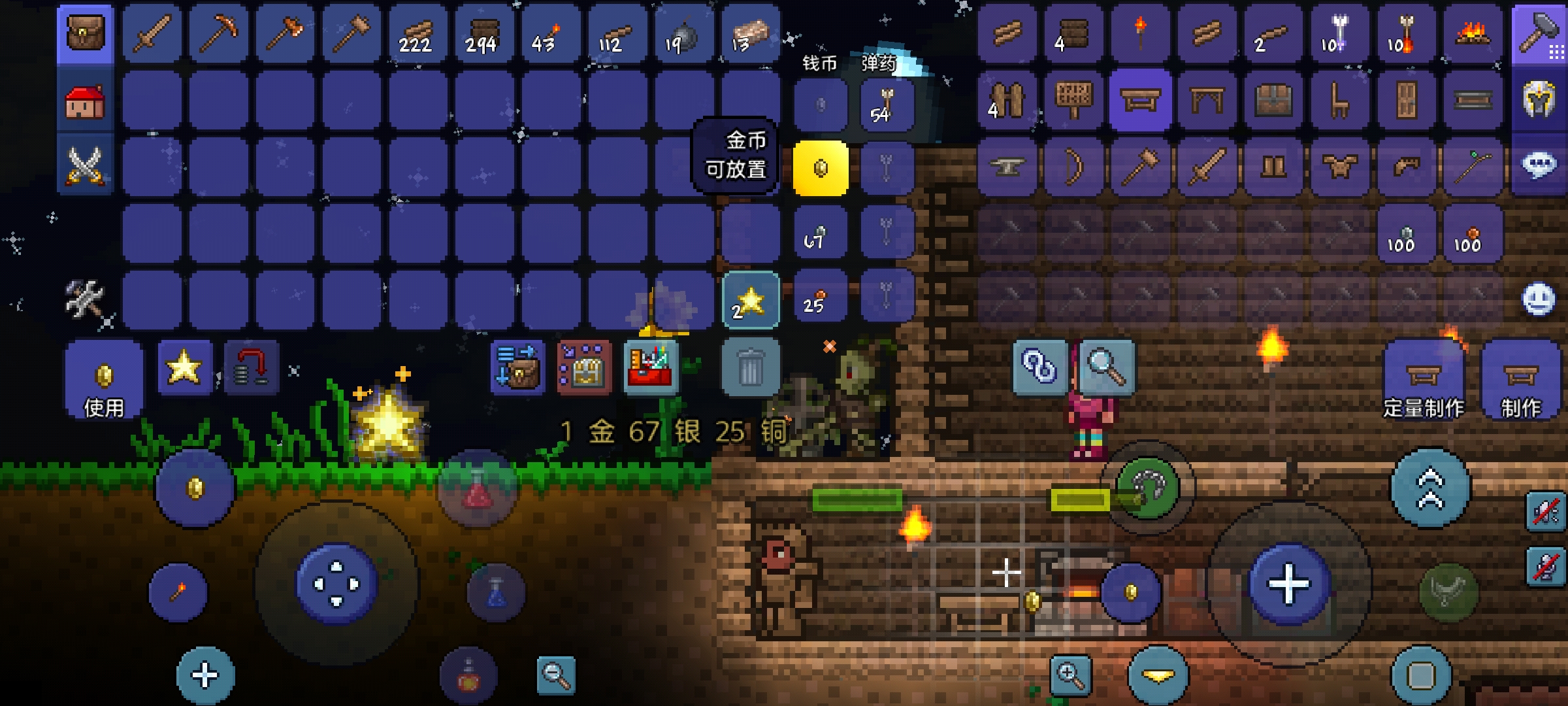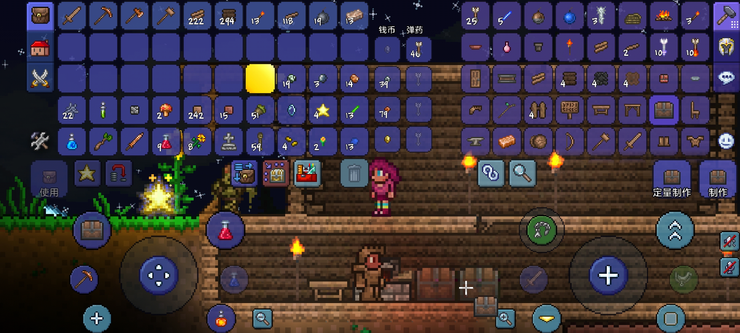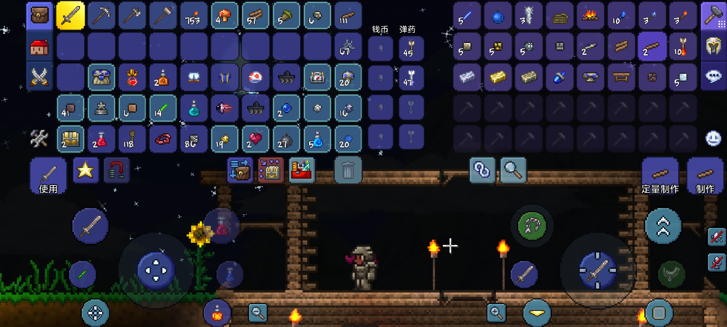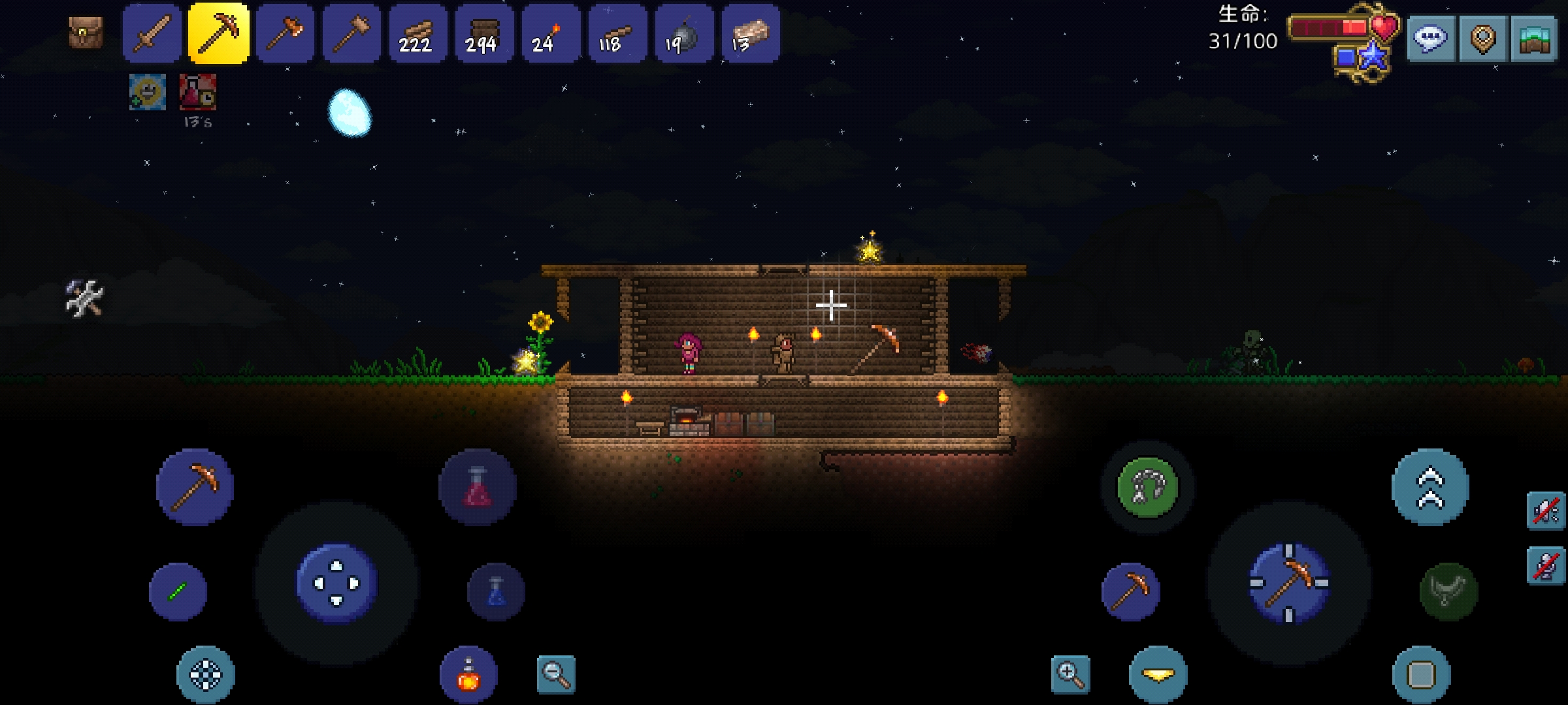天亮了,我们把墓碑挖掉然后把金币放进箱子里我们再做一套铁质装备然后去砍点树做点平台吧!