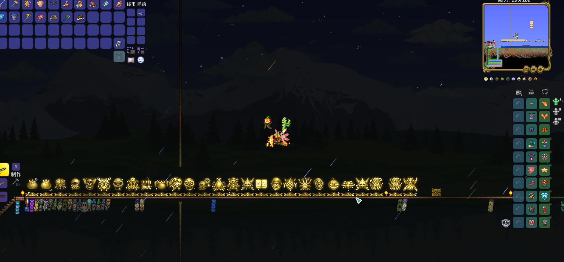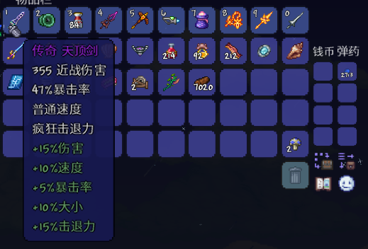 虽然很简陋,但是这个存档我也完了很长时间了,霜月和南瓜月我也打了很多次了,最后得到了最强的战士武器——天顶剑!忍痛去铂金吞噬者那里敲了几下,弄了个传奇词缀……