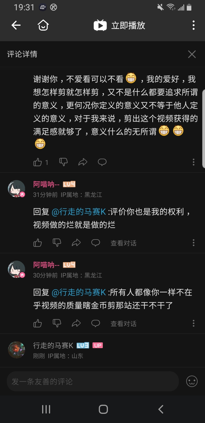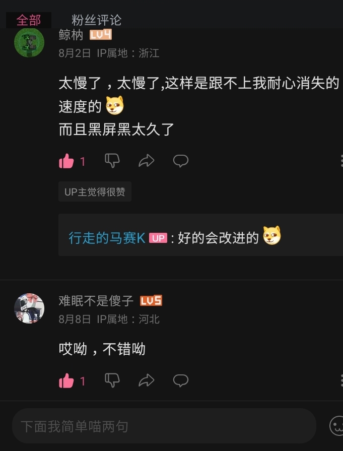 起猛了,看见自家视频有乐子 行走的马赛克 太阳落下,我感觉是落日的余晖出卖了我 某些人指出不足(虽然好像啥也没指出,净喷) 对比:不同的人指出不足(有用且礼貌) 这俩是另一条视频 真的有些无语=_= 评论( {{ count }})条 只看作者 {{ form.sort_type == "desc" ? "最新" : "最早" }} 简单说两句... 发表 {{ item.user_detail["nick_name"] }} {{ item.user_detail["title"] }} @{{ at_user.nick_name }} {{ parseTime(item.add_time) }} 来自 {{ item.from_region || item.user_detail["city"]||"未知" }} {{ item.user_detail['tail'] || "" }} {{ item.childs.length }} {{ item.collect_count }} {{ item.like_count }} {{ comment_child.user_detail["nick_name"] }} @{{ at_user.nick_name }} {{ parseTime(comment_child.add_time) }} 来自{{ comment_child.from_region||comment_child.user_detail['city'] || "未知" }} {{ comment_child.user_detail['tail'] || "" }} {{ comment_child.like_count }} {{ comment_child.collect_count }} [展开更多] [折叠] 📢 暂无内容 简单说两句... {{ count }} - - 🤔 ⬆️ ↪️ 回复 ⭐️ 点赞 ❤️ 收藏 ❗️ 举报 ⛔️ 删除 回复 发表 MD内容 图片 视频 表情 @馆友 发表 提到 等 {{ activeAtIds.length }}人 {{ item.title }} {{ item.nick_name }} 请输入MD格式的内容
