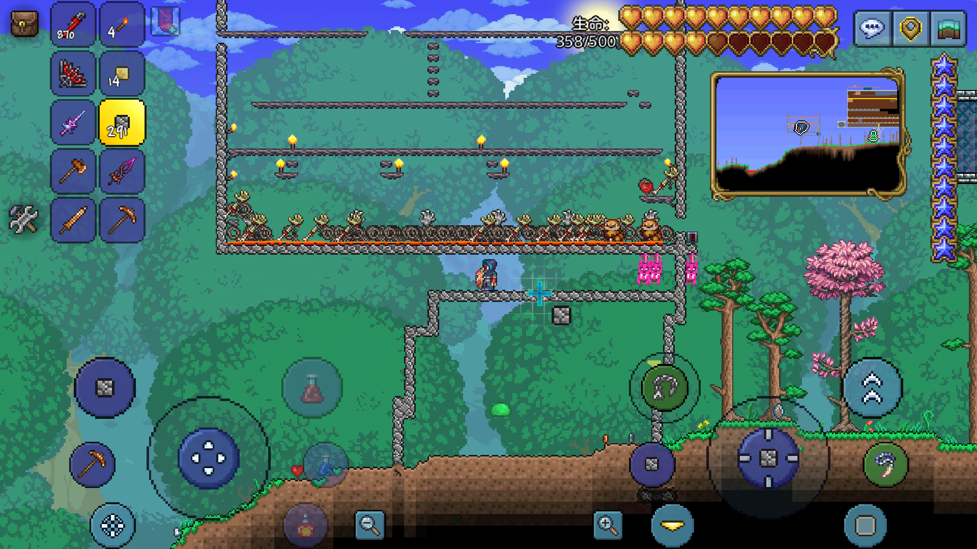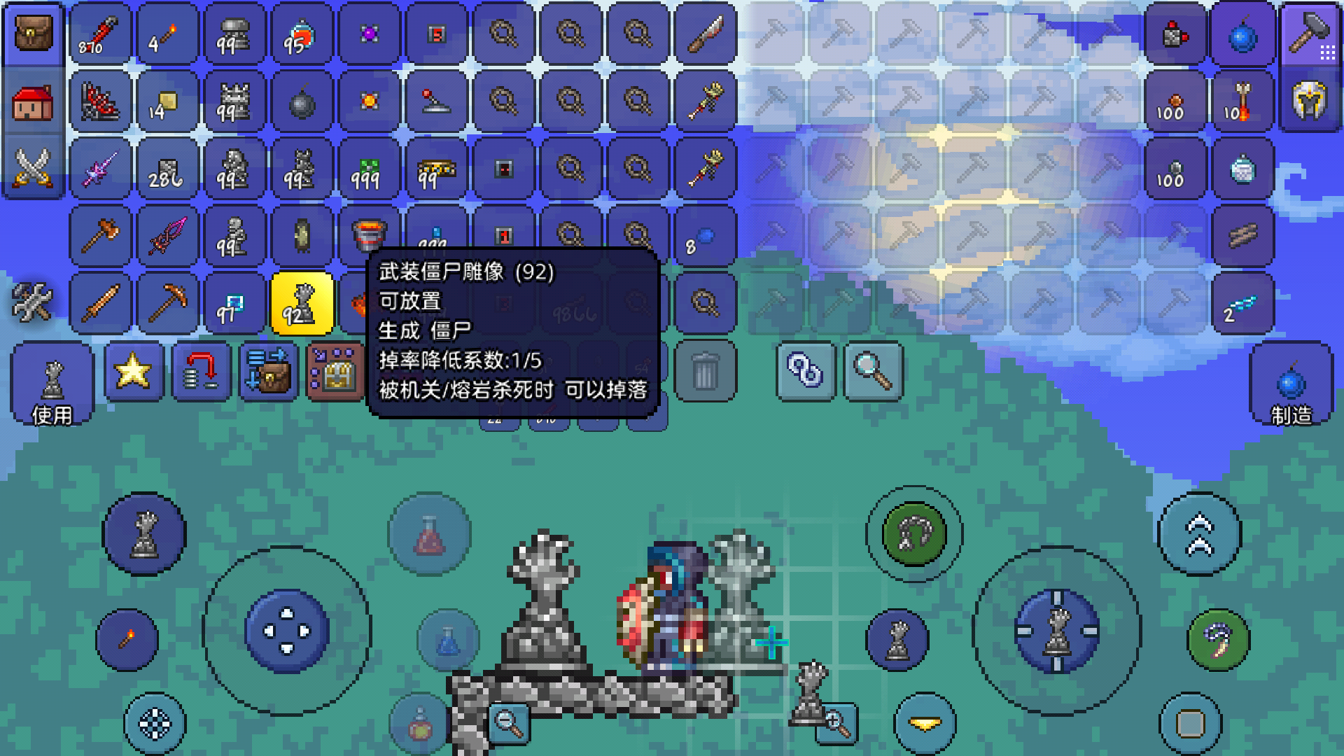 这个武装僵尸在被熔岩或机关杀死时,可以掉落物品,所以我们就可以拿它来刷钱了。