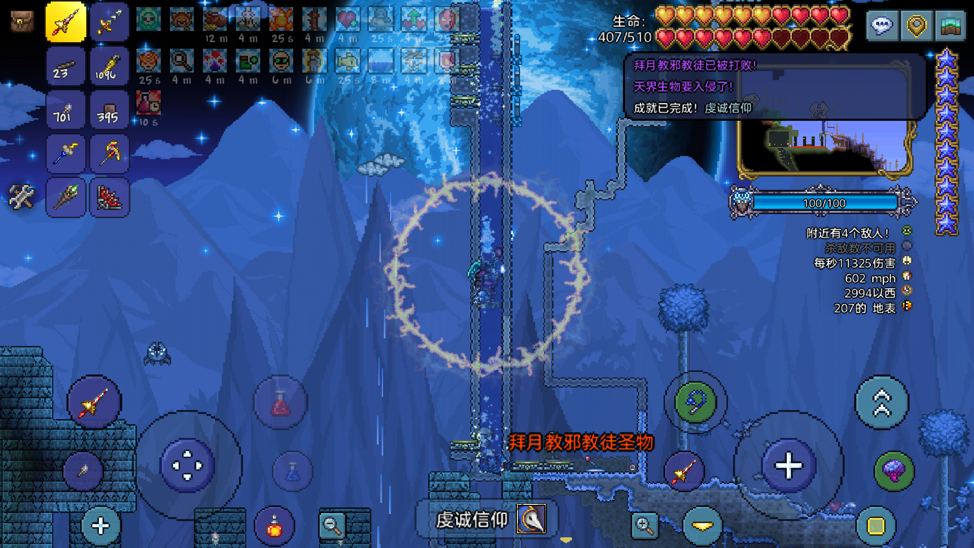 (注:我在打拜月教徒时,发现这个装置也有一个缺陷:当拜月教徒有多个分身时,无法打到他本人,所以最佳攻击机会是,当他刚被召唤出来时,和当他有五个分身时,抓住这两个时刻便可以秒杀他。)