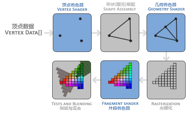 接下来,下图是GPU渲染图像的流程,其中,蓝色部分是大部分着色器语言(例如opengl)可以操作的。
