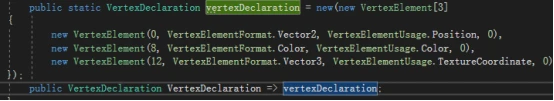 我这里不会详细去讲VertexDeclaration这个东西,你只管往里面丢入需要的VertexElement(顶点元素)即可。
