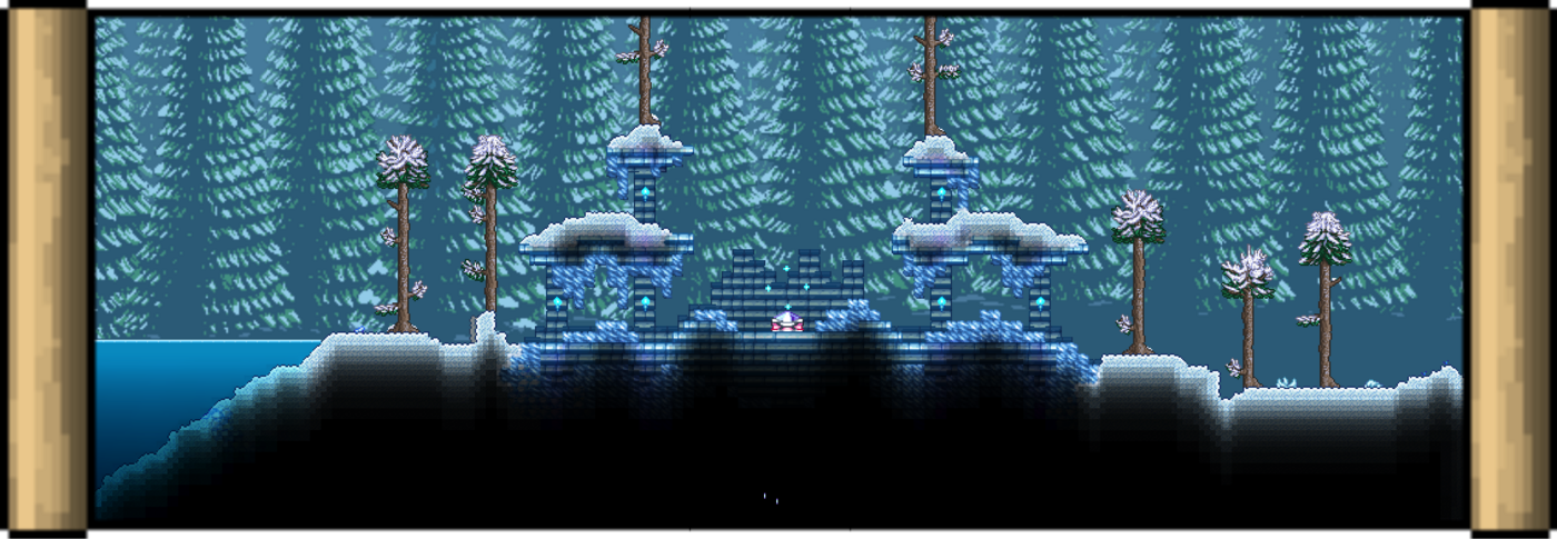 霜冻废墟中有一件冰霜工艺品,它矗立在一个由硬冰砖和冰矿制成的平台上,平台两侧还有四个由硬冰砖和冰石制成的高架平台,顶部覆盖着雪块。霜制品下面埋着一个锁定的永久冻土镀膜胶囊,当用旧钥匙打开时,可获得一把釉弓。