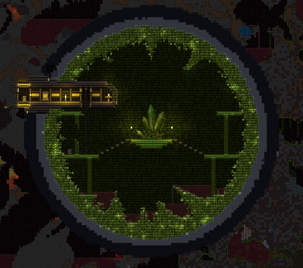 和活力晶洞一样,它有一个小的Evostone和大理石外层,然后是一个稍大的活力晶石碎片层。与小型晶洞不同的是,这座圣殿的中间有一块巨大的水晶,放在活力晶砖平台上。圣殿结构内部有一个像是研究中心的土层,它通过门从晶洞中延伸出一条隧道。