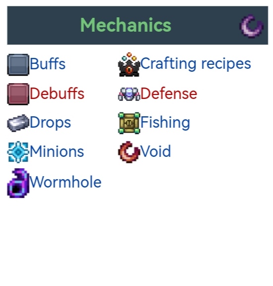 模组在这些方面有新的内容:增益、减益、掉落、随从、虫洞、食物、防御、钓鱼、虚空