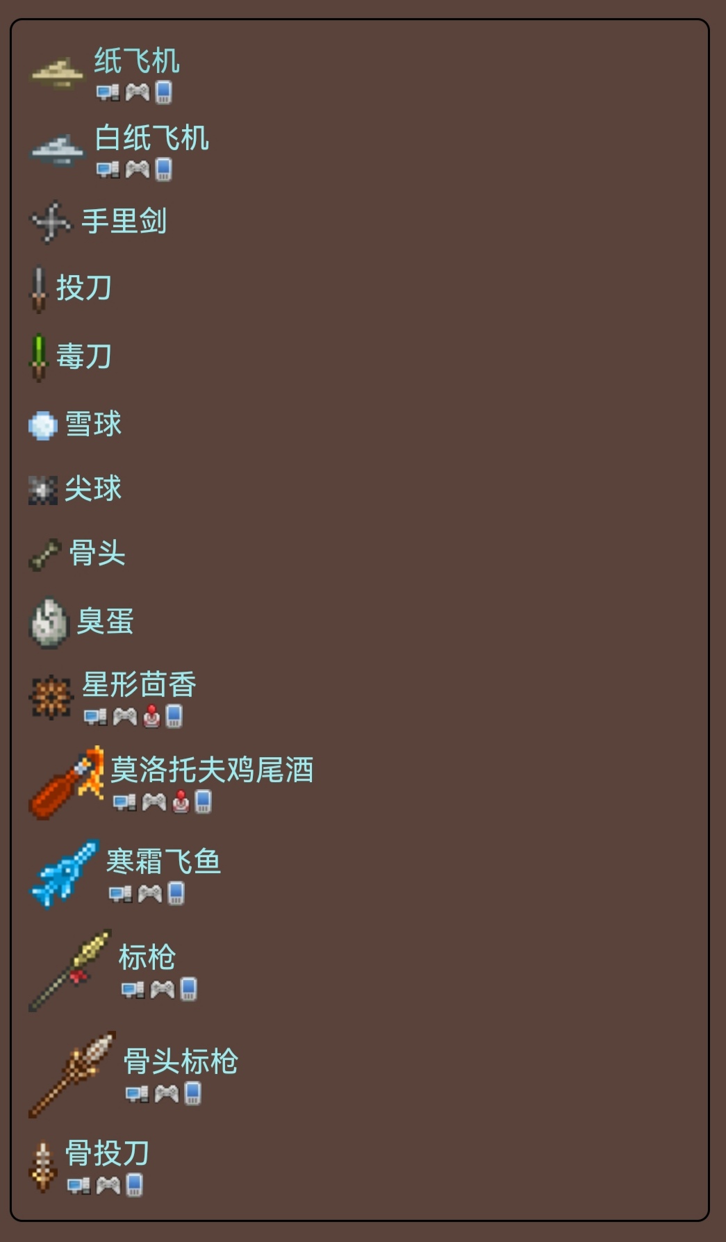信号枪使用弹药,但不造成远程伤害。一些物品名字里也有“枪”这个字(比如食人鱼枪、太空枪或水枪),但是都无需弹药。