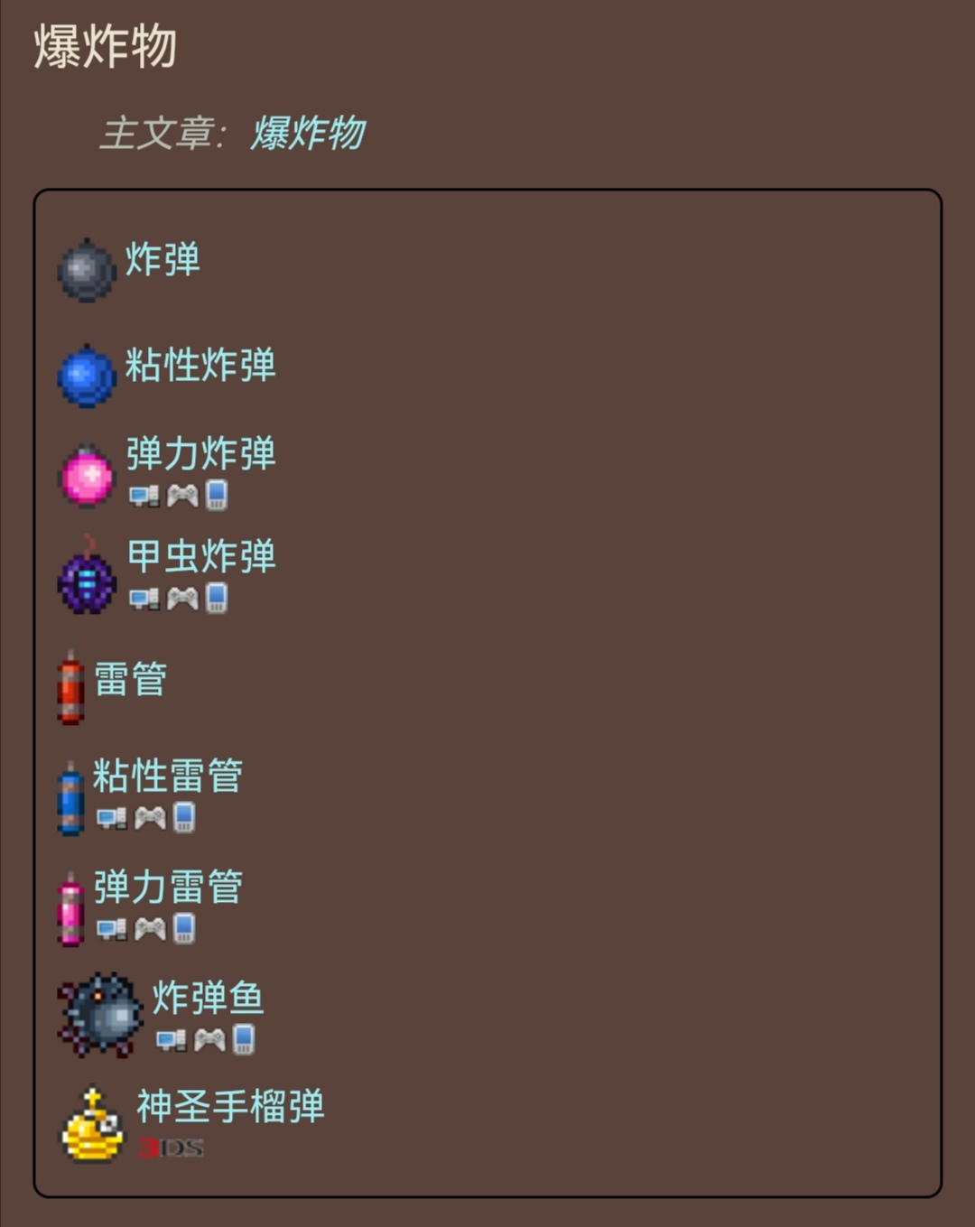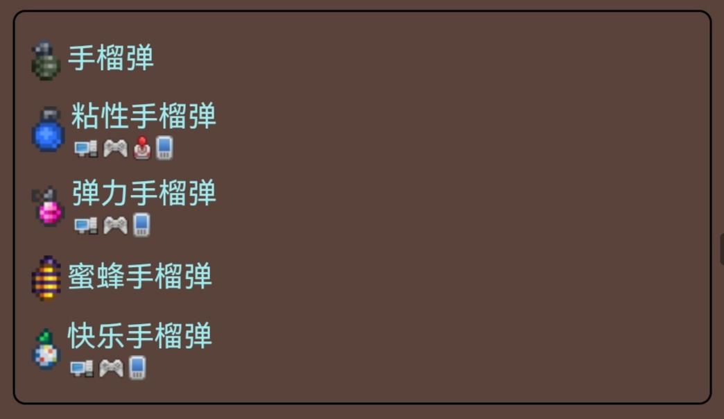 这些远程武器的独特之处在于它们使用后就消失了,其弹药数量取决于手头拥有的数量。目前在泰拉瑞亚中一共有20种不同的消耗型武器可用,其中有5种是手榴弹。
