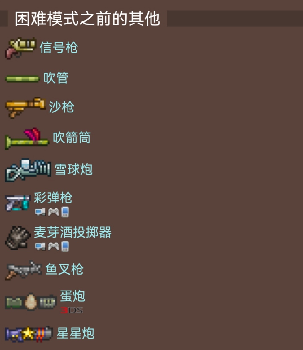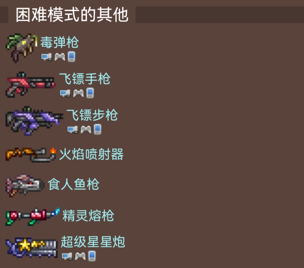 目前在泰拉瑞亚中一共有 27 种不同的枪可用,其中 15 种是困难模式独有的。