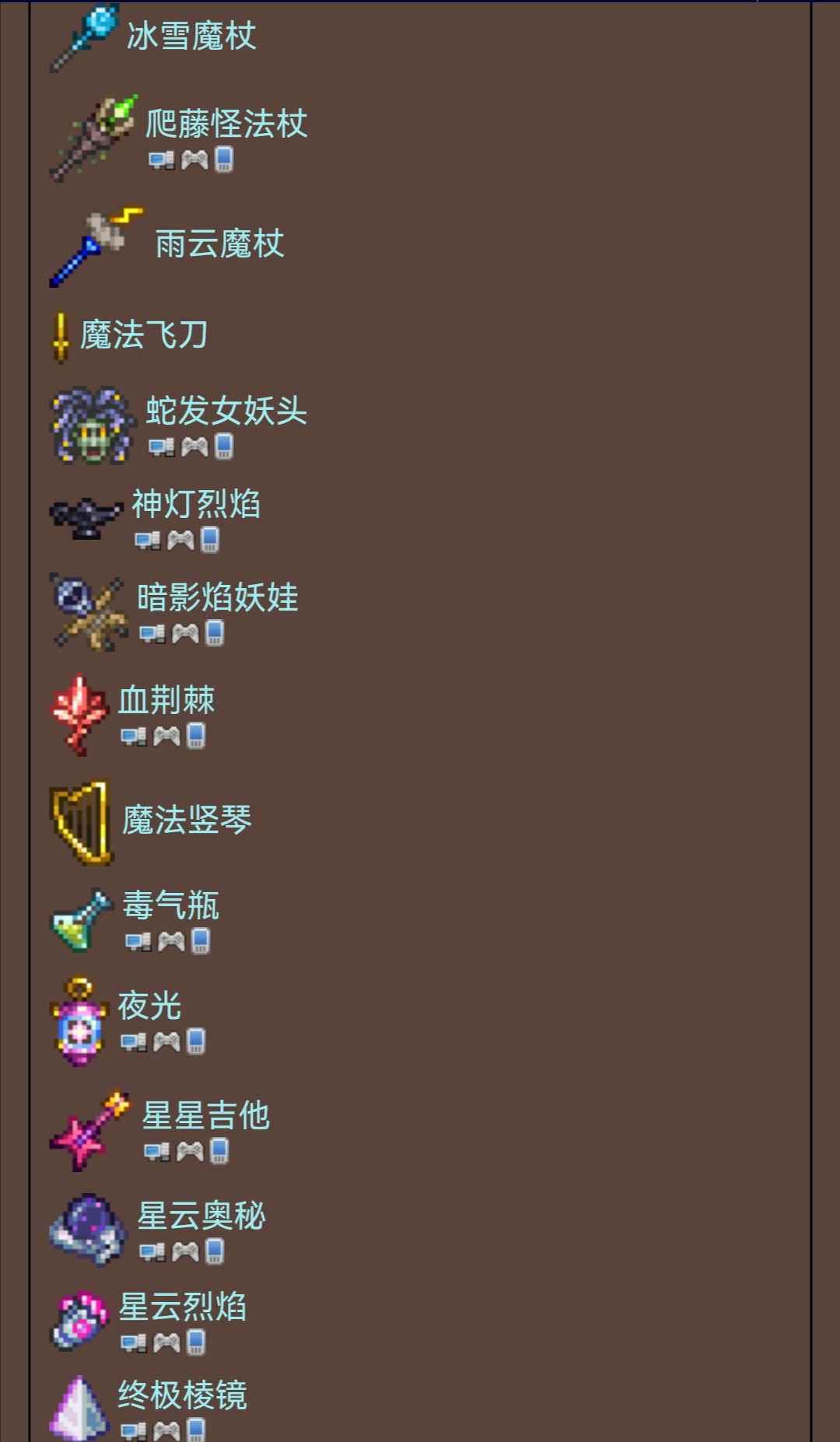 目前在泰拉瑞亚中一共有 36 种不同的魔棒可用,其中 21 种是困难模式独有的。