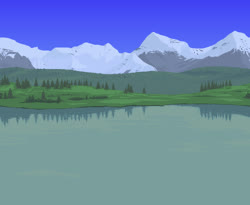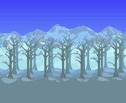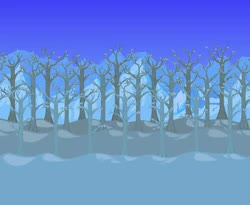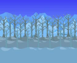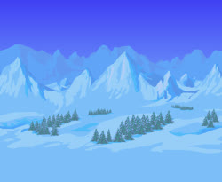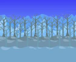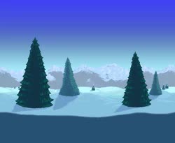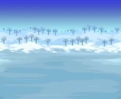 长有松树的雪原,冻结的湖后方有几堆雪球和一个雪人。