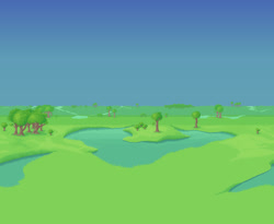 类似沼泽的地景,长有稀疏的丛林树,以及动态的水体。