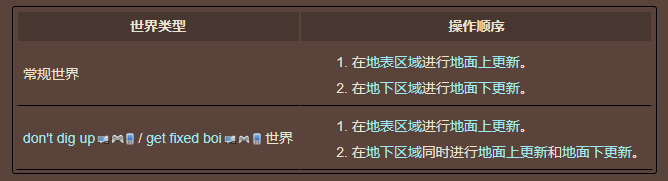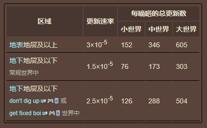 在不同条件下有 3 个不同的更新速率。下表是正常时间速率下(1×),所有世界大小中特定区域内的每嘀嗒的总更新数。