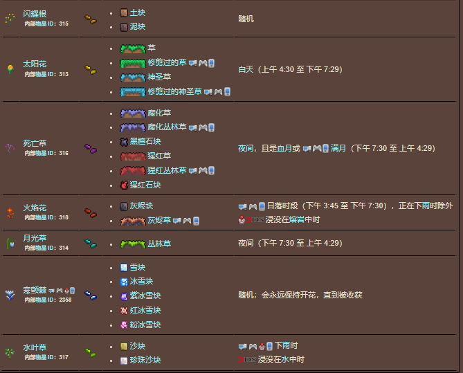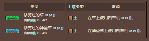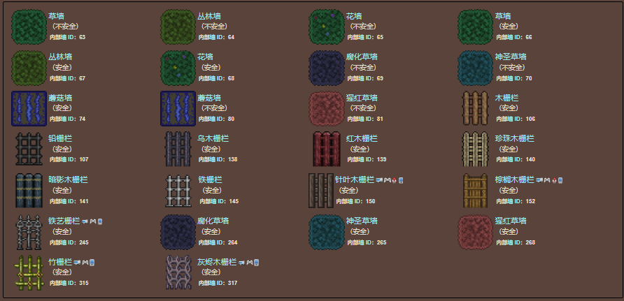 当某些类型的植物试图生长时,土壤块所在的那一格和土壤块上方的那一格必须未被墙占据,或是下方列出的墙。