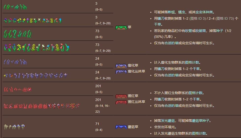这些杂草和花会在位于地表的不同类型的草上天然生长。除了丛林草、蘑菇草、和灰烬草上的以外,它们不会在低于地表处生长,不会在修剪过的草上生长。在有油漆的草块上生长的植物会继承物块的颜色。