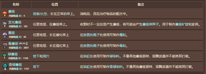 蘑菇在《泰拉瑞亚》中是随机生长在很多草和其他物块上的植物。目前一共有 6 种蘑菇。