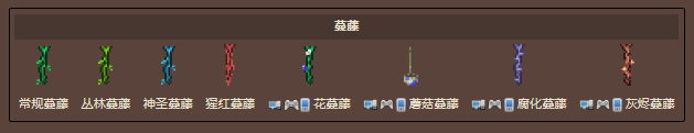 总共有八 / 四种不同类型的蔓藤:常规蔓藤(从草和树叶块上长出)、丛林蔓藤(从丛林草块上长出)、神圣蔓藤(从神圣草块上长出)、猩红蔓藤(从猩红草块上长出)、花蔓藤(从长草洞穴中的草上或玩家放置的草墙或花墙前长出)、发光蘑菇蔓藤(从蘑菇草上长出)、腐化蔓藤(从腐化草上长出)、和灰烬蔓藤(从灰烬草上长出)。