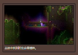 生命果是一种消耗品,可以使玩家的最大生命永久提高 5,上限为 500(使用 20 个)。它们可以在至少击败一个机械 Boss后 / 困难模式下于地下丛林中找到。击败的机械 Boss越多,生命果就越常见。生命果会在洞穴探险药水的作用下发光。