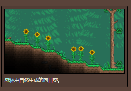 向日葵是地表植物,能防止腐化和猩红(和神圣)蔓延到它们自身所在的物块,并为附近的玩家提供快乐!增益,略微增加他们的移动速度同时降低敌怪生成速度。