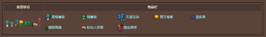 草药用于在放置的瓶子或炼药桌处制作药水。他们出现在世界各地,或出现在草药袋中,可以用几乎任何武器或工具收割。每种草药都会在符合某些要求时开花。在开花时收割草药会额外掉落 1-3 颗相应种子。